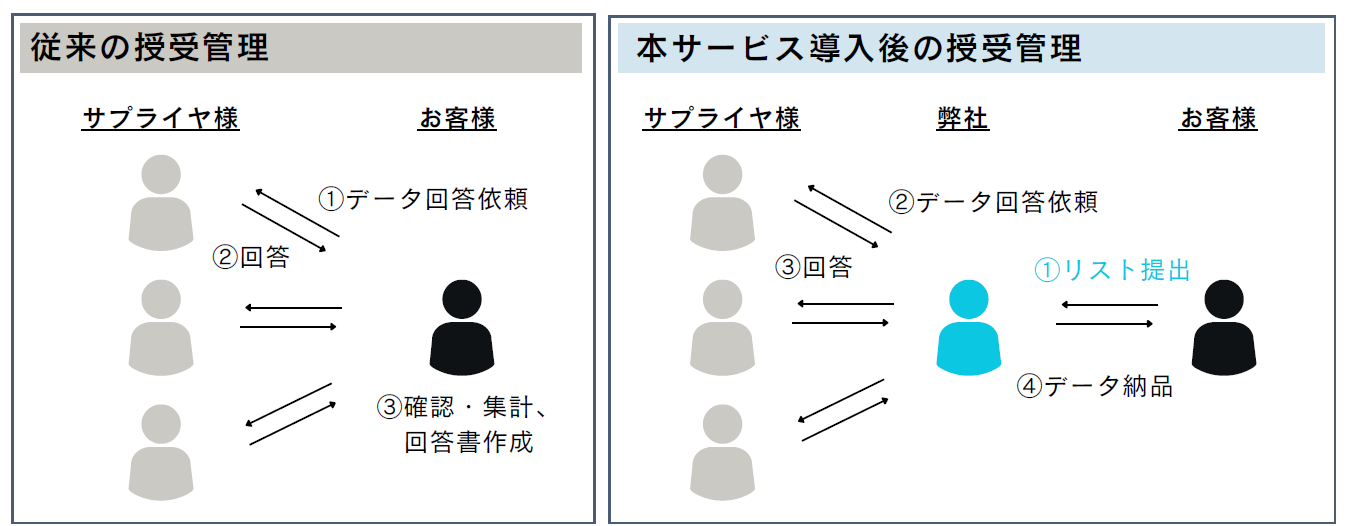 お客様のサプライヤ様に対してアンケート調査を実施し、chemSHERPA対応の可否をレポートにまとめて提出します。